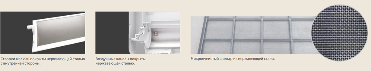 • STAINLESS CLEAN — створки жалюзи, воздушные каналы и фильтр изготовлены с применением нержавеющей стали, это обеспечивает чистоту внутри кондиционера и эффективную очистку воздуха, проходящего через него.