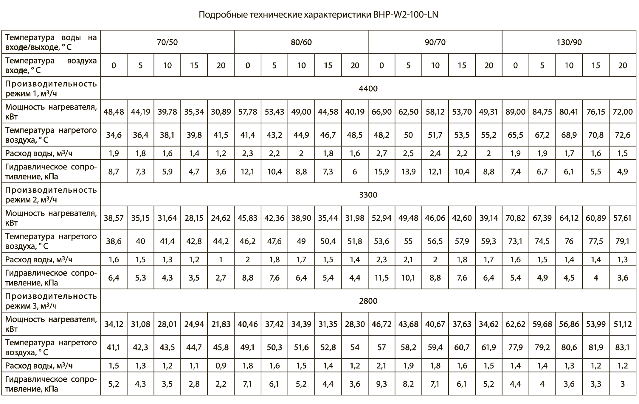 Тепловые характеристики приведены при температуре воздуха в помещении +15С и максимальном расходе воздуха.