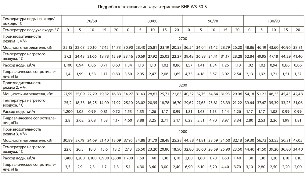 Тепловые характеристики приведены при температуре воздуха на входе +0 °С, максимальном расходе воздуха и максимальной температуре теплоносителя (указанной в таблице тепловой мощности от производителя).