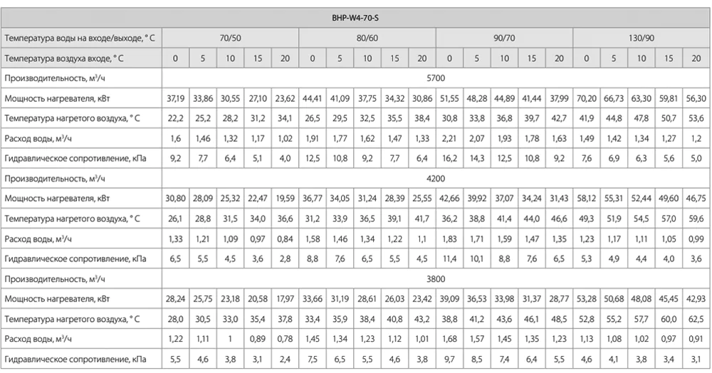 Тепловые характеристики приведены при температуре воздуха на входе +0 °С, максимальном расходе воздуха и максимальной температуре теплоносителя (указанной в таблице тепловой мощности от производителя).