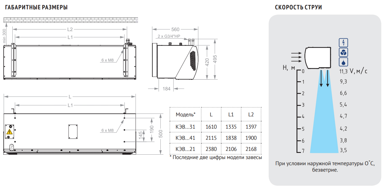 Эффективная длина струи может служить оценкой допустимой ширины или высоты проема, который защищает завеса. При вертикальной установке завес с двух сторон проема, значение, следует понимать как полуширину. Параметр указан только для "мягких" наружных условий, т.е. температура воздуха не опускается ниже 0 °С, а скорость ветра не превышает 1м/с, приточно-вытяжная вентиляция сбалансирована. Любое ужесточение условий уменьшает эффективную длину струи на 50%.