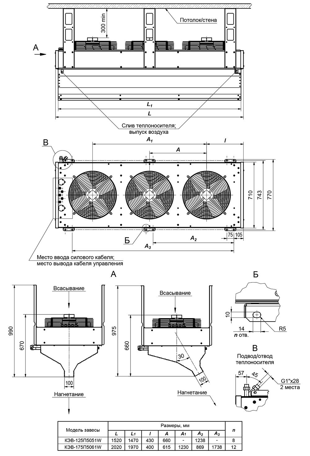 Промышленная тепловая завеса шиберующего (отсекающего) типа из оцинкованной стали с защитой корпуса IP54 (допускается капельная влага, туман). Устанавливается внутри помещения, горизонтально над проемом или вертикально, сбоку от него, как можно ближе к краю. При большой ширине проема можно располагать сразу несколько завес вплотную друг к другу и управлять ими с одного пульта. Применяется в складских помещениях, гаражах, производственных предприятиях, ангарах, самолетных и вертолетных площадках, автомойках и других помещениях большой площади.