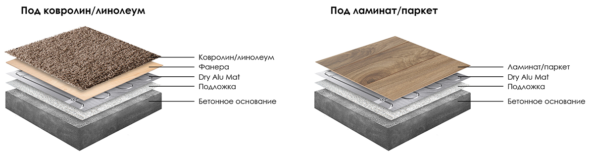 Безопасный, простой в установке мат для комфортного обогрева поверхности пола в помещениях с имеющимся основным отоплением. Dry Alu Mat представляет из себя тонкий кабель, помещенный между слоями алюминиевой фольги. Мат имеет толщину всего 1,5 мм, благодаря чему практически не изменяет уровень пола. Данный вид теплого пола подходит под такие покрытия, как: ковролин, линолеум, ламинат, паркетная доска. Одним из главных преимуществ также является "сухой" монтаж — мат не требует установки в стяжку или плиточный клей. При установке под мягкие покрытия (линолеум и ковролин) поверх мата необходимо уложить лист фанеры 6 мм. Ламинат и паркет можно укладывать прямо поверх мата.