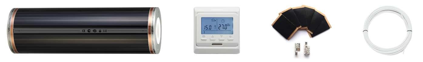 Готовый комплект инфракрасного пленочного теплого пола с электронным терморегулятором — это простое и экономичное решение по организации комфортного подогрева пола в помещении. Пленка монтируется сухим способом, не требует стяжки, и подходит даже для законченного ремонта. Толщина полотна всего около 0,4 мм и укладывать его можно под ламинат, линолеум, ковролин, паркетную доску.