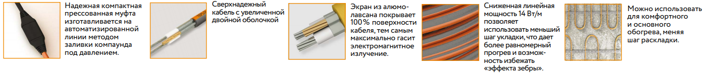Электрическая система «теплый пол» на основе двухжильного греющего кабеля с увеличенным сечением жил. Покрыт сверхнадежной усиленной оболочкой предотвращающей повреждения на изломы. Экранирован алюминиевой фольгой, препятствующий электромагнитному излучению. Служит в качестве дополнительного, основного обогрева в холодных помещениях. Монтируется в стяжку под любое напольное покрытие. Применяется в бытовых, коммерческих и промышленных объектах.