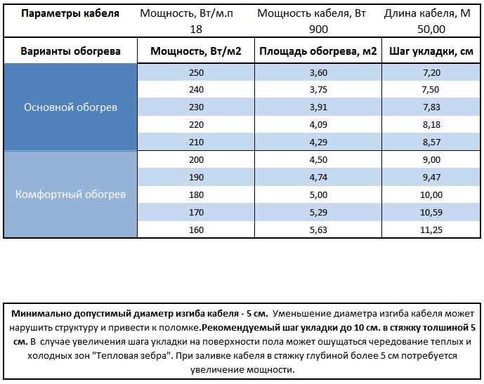 Площадь обогрева секцией кабеля напрямую зависит от требуемой мощности на 1 м².